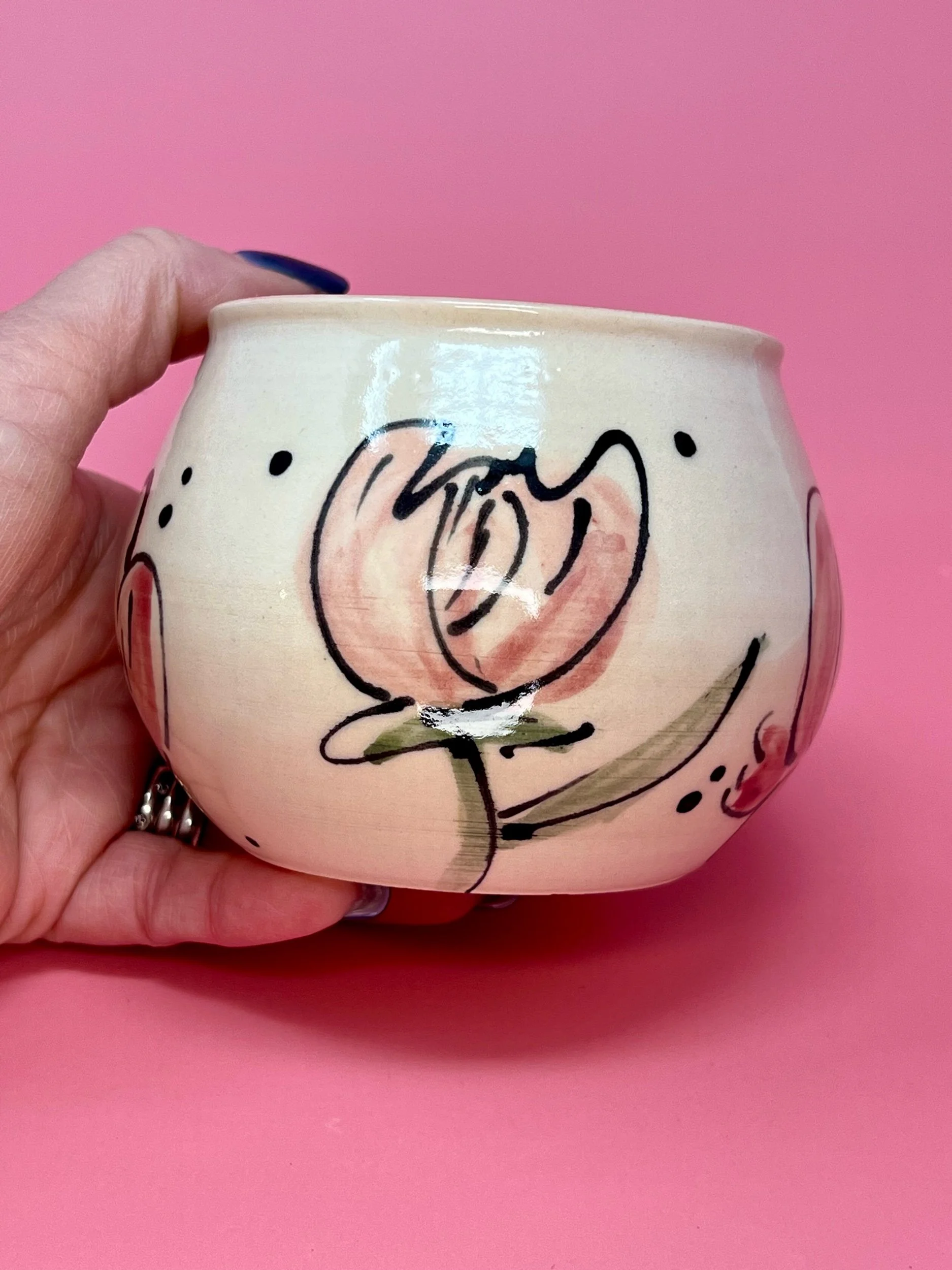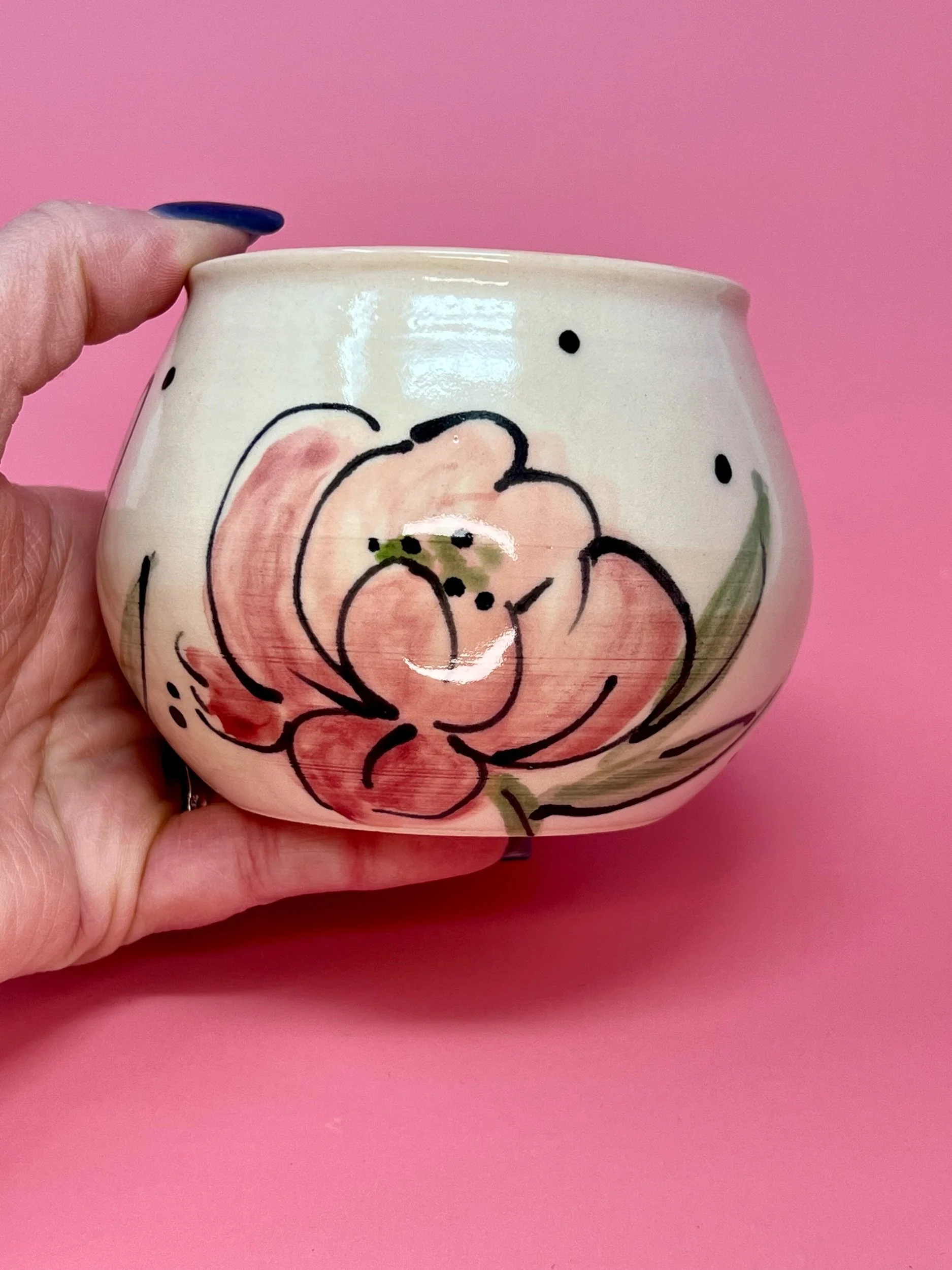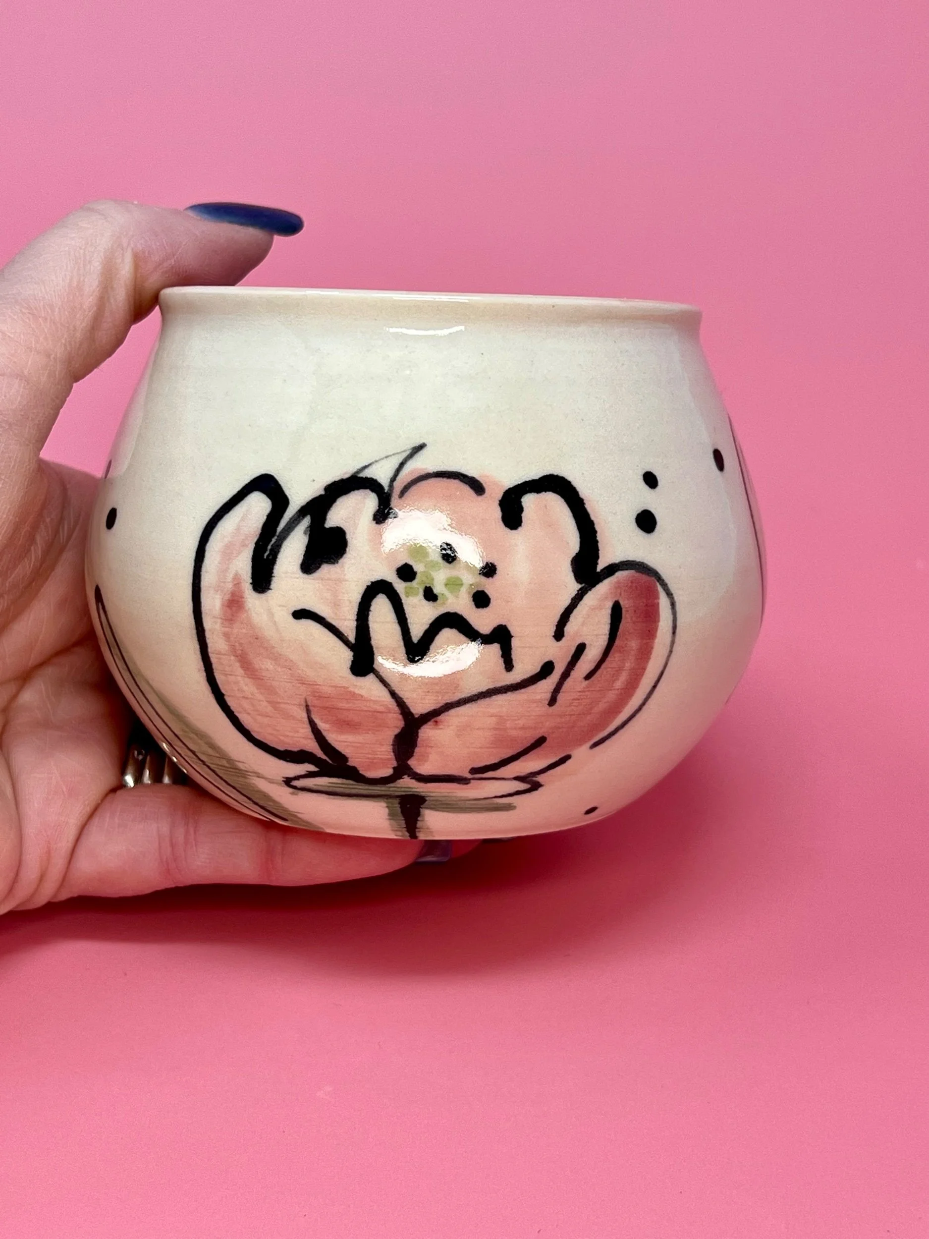 This item holds approximately 14oz and is handmade on the pottery wheel from a white porcelain clay. All Designs are original hand painted one of a kind designs.