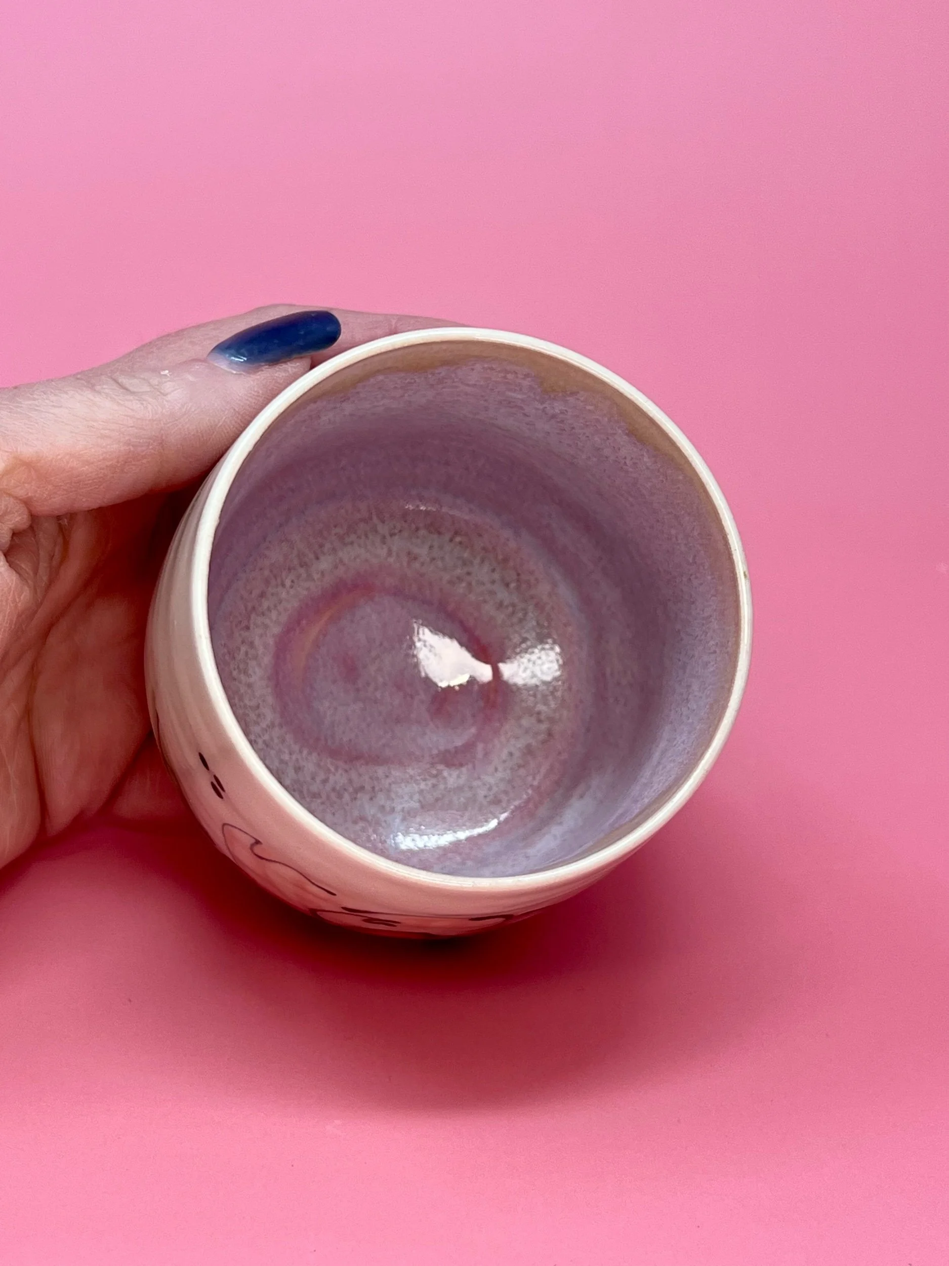 This item holds approximately 10oz and is handmade on the pottery wheel from a white porcelain clay. All Designs are original hand painted one of a kind designs.