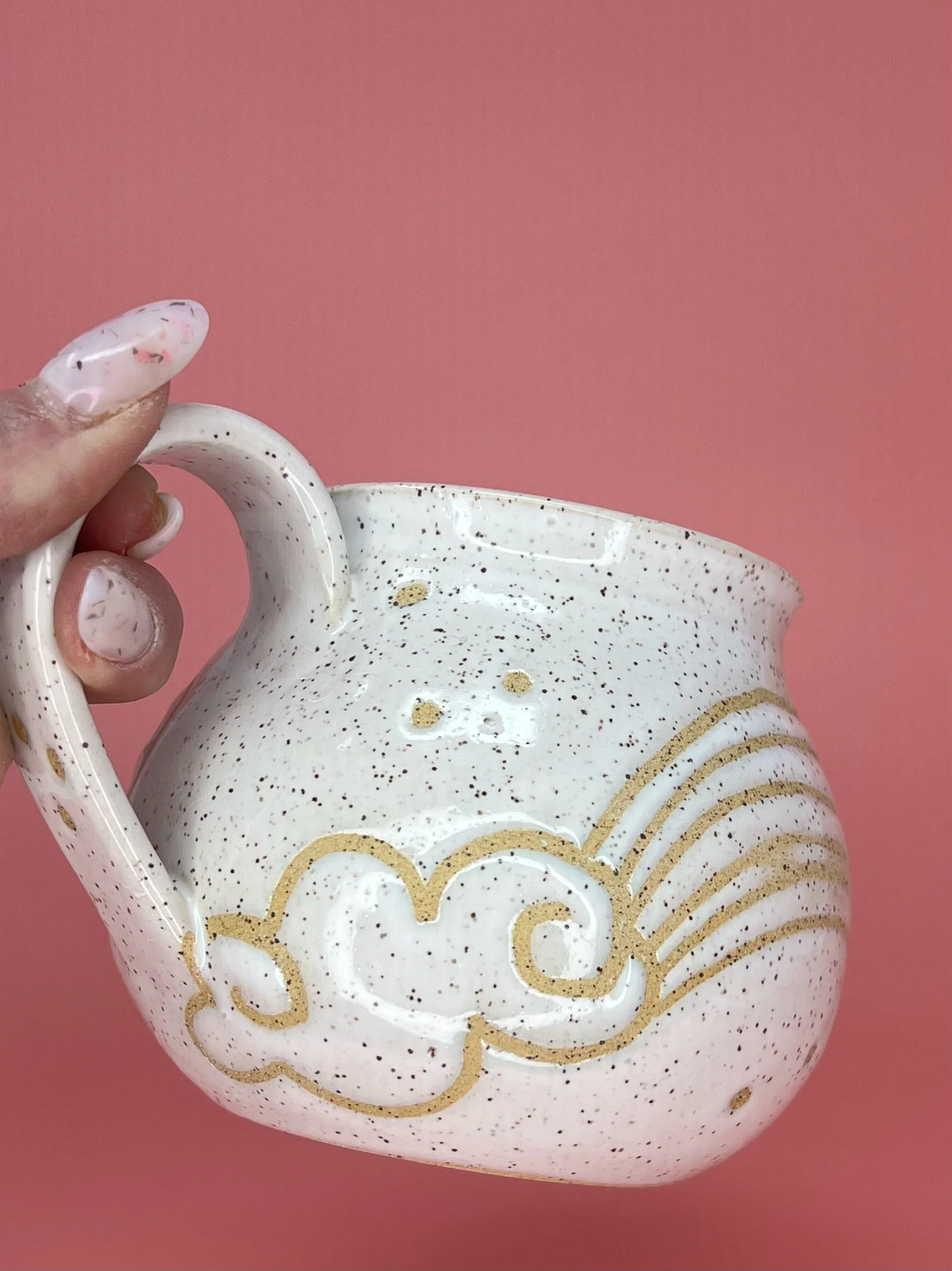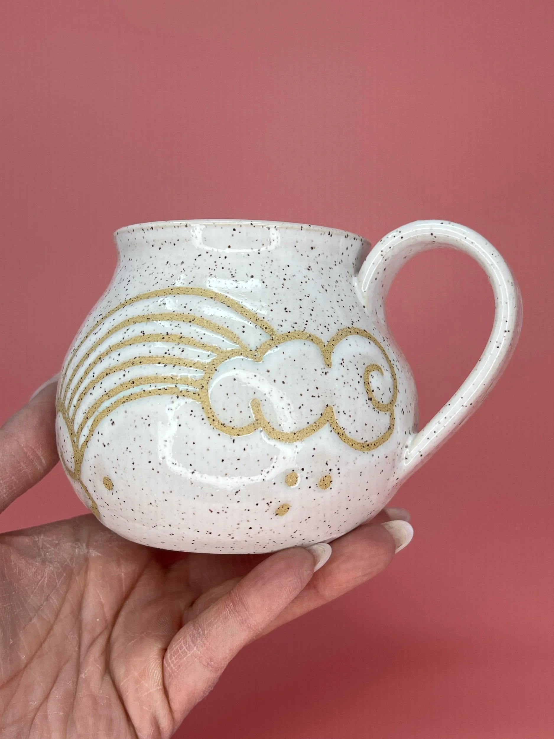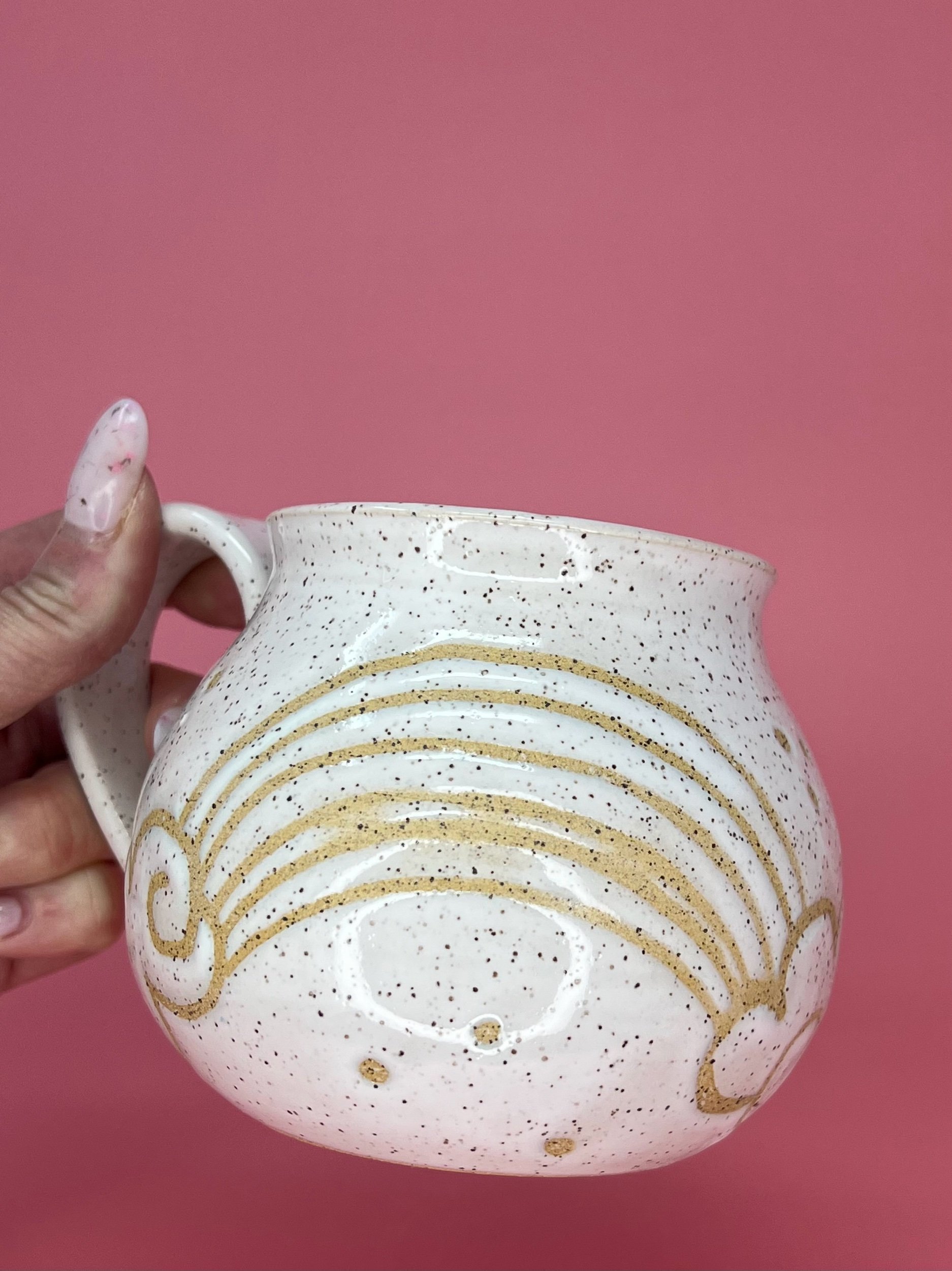 Wheel throne speckled clay belly mug. Approximately 14 ounces of fluid. Hand drawn, designs and finished in white gloss glaze. The mug is dishwasher and microwave safe.