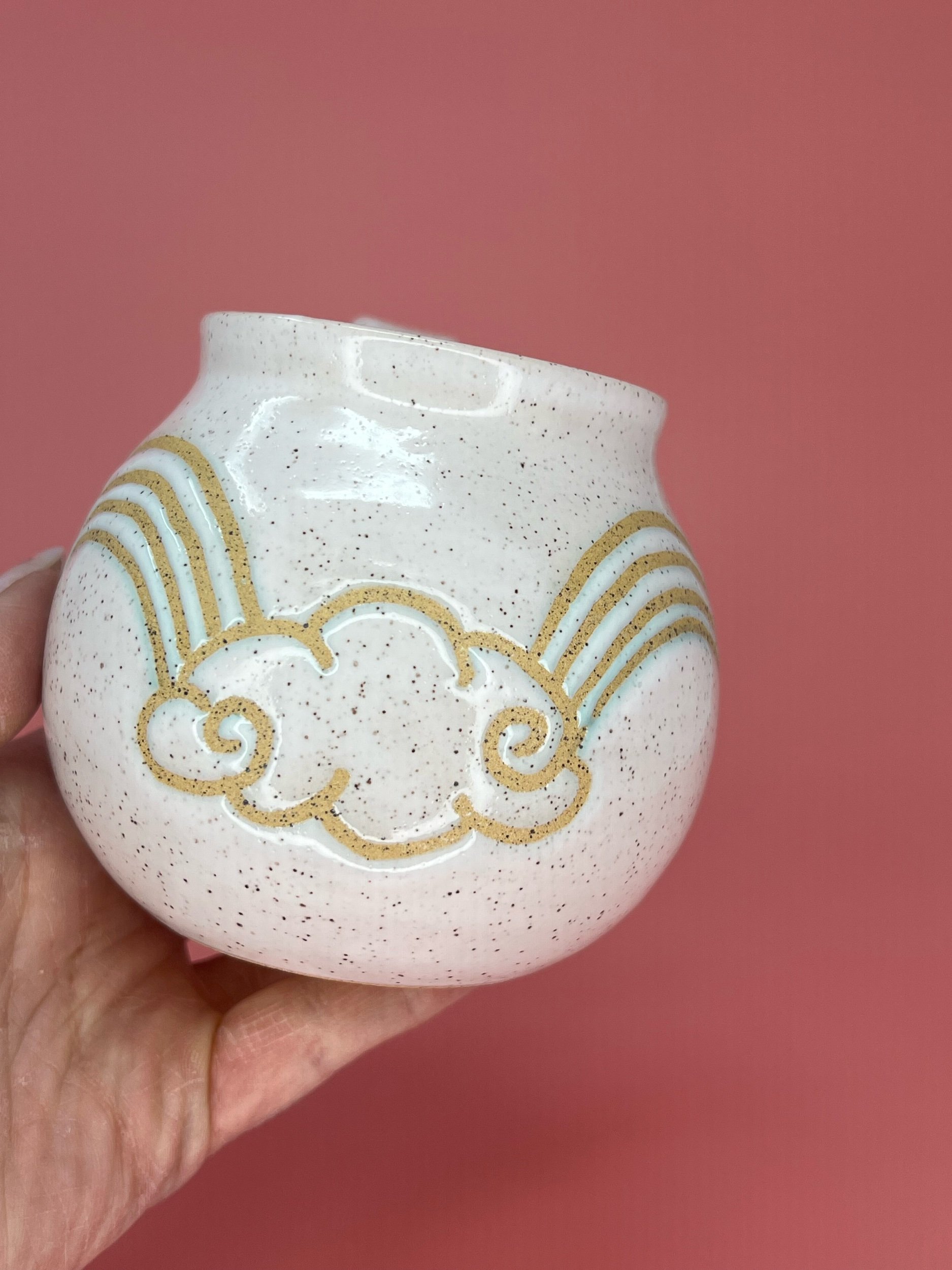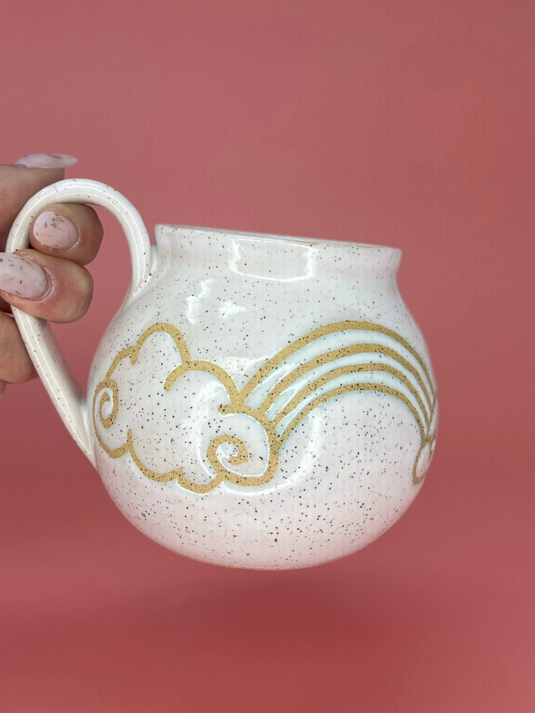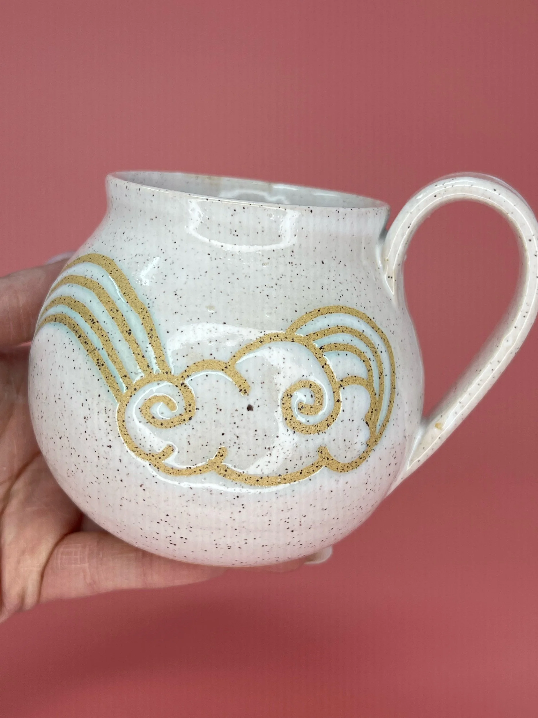Wheel throne speckled clay belly mug. Approximately 14 ounces of fluid. Hand drawn, designs and finished in white gloss glaze. The mug is dishwasher and microwave safe.