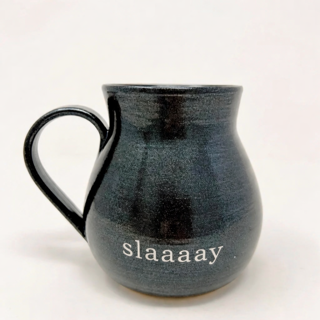 wheel thrown from white porcelain and hand painted in our black magic glitter glaze with our signature, saying for those days when you just need it….fuuuuck