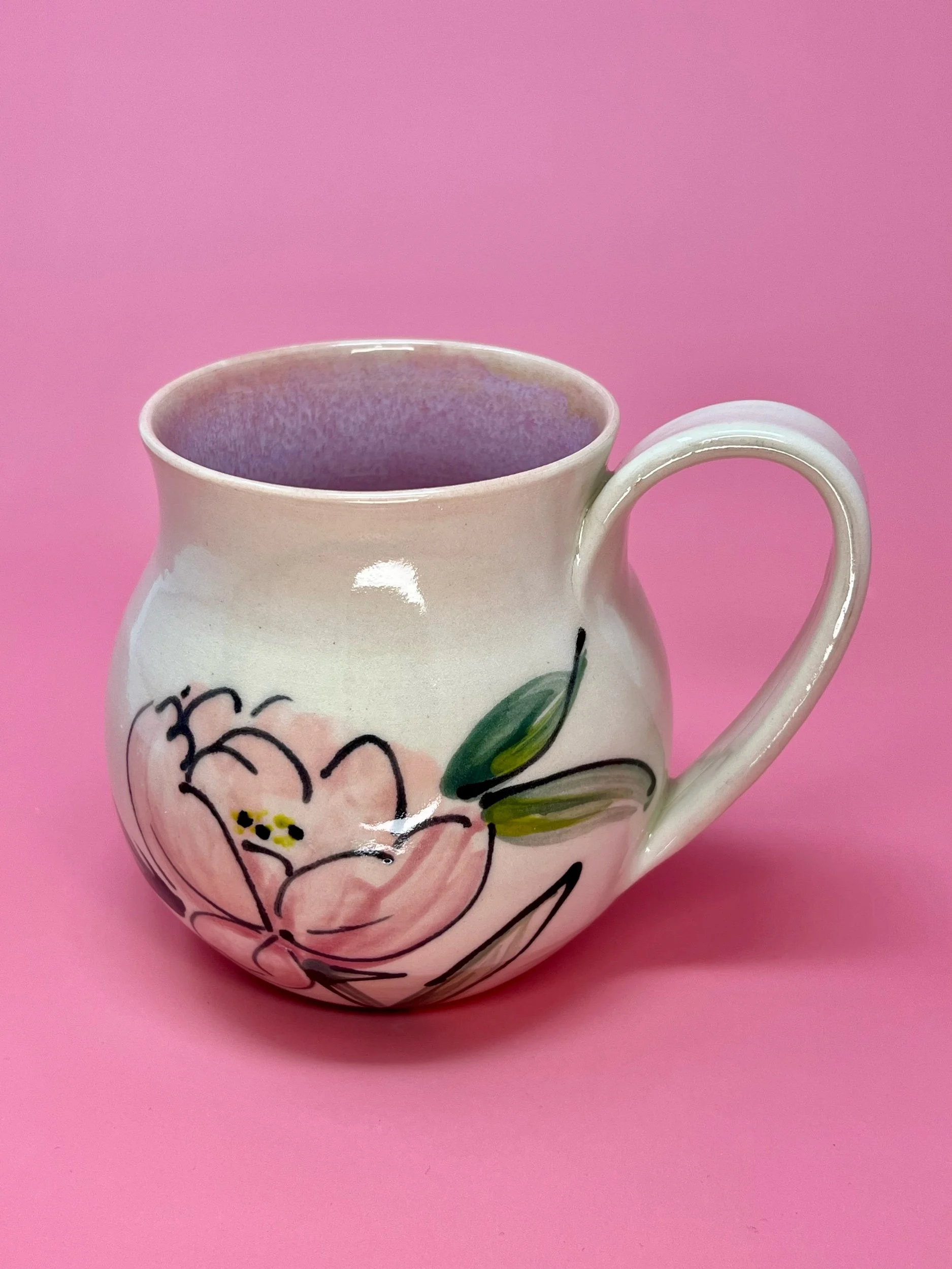 This item holds approximately 16oz and is handmade on the pottery wheel from a white porcelain clay. All designs are original hand painted one of a kind designs.