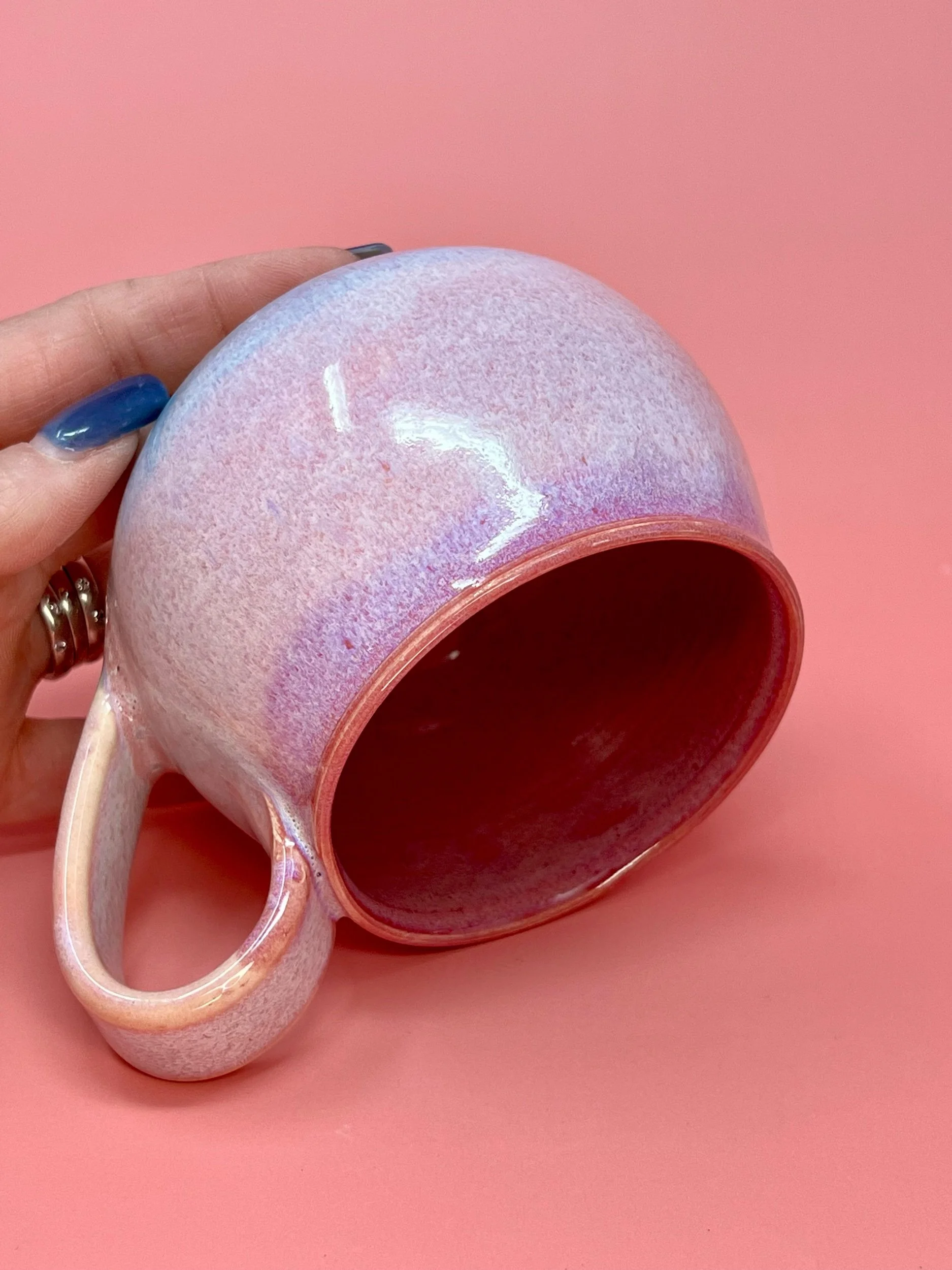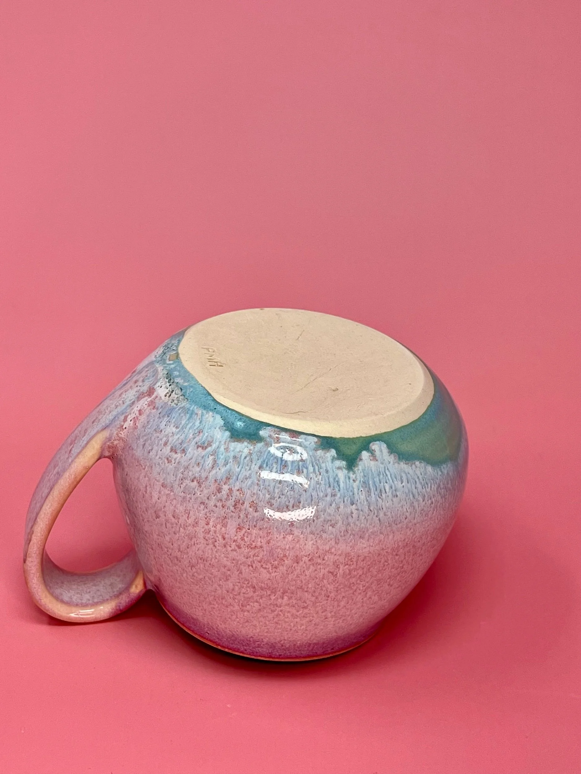 This item holds approximately 14 oz and is handmade on the pottery wheel from a white porcelain clay. All Designs are original hand painted one of a kind designs.