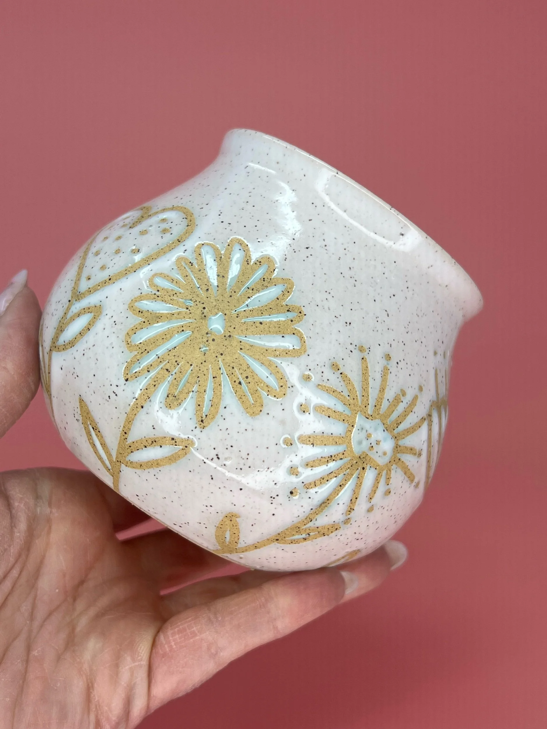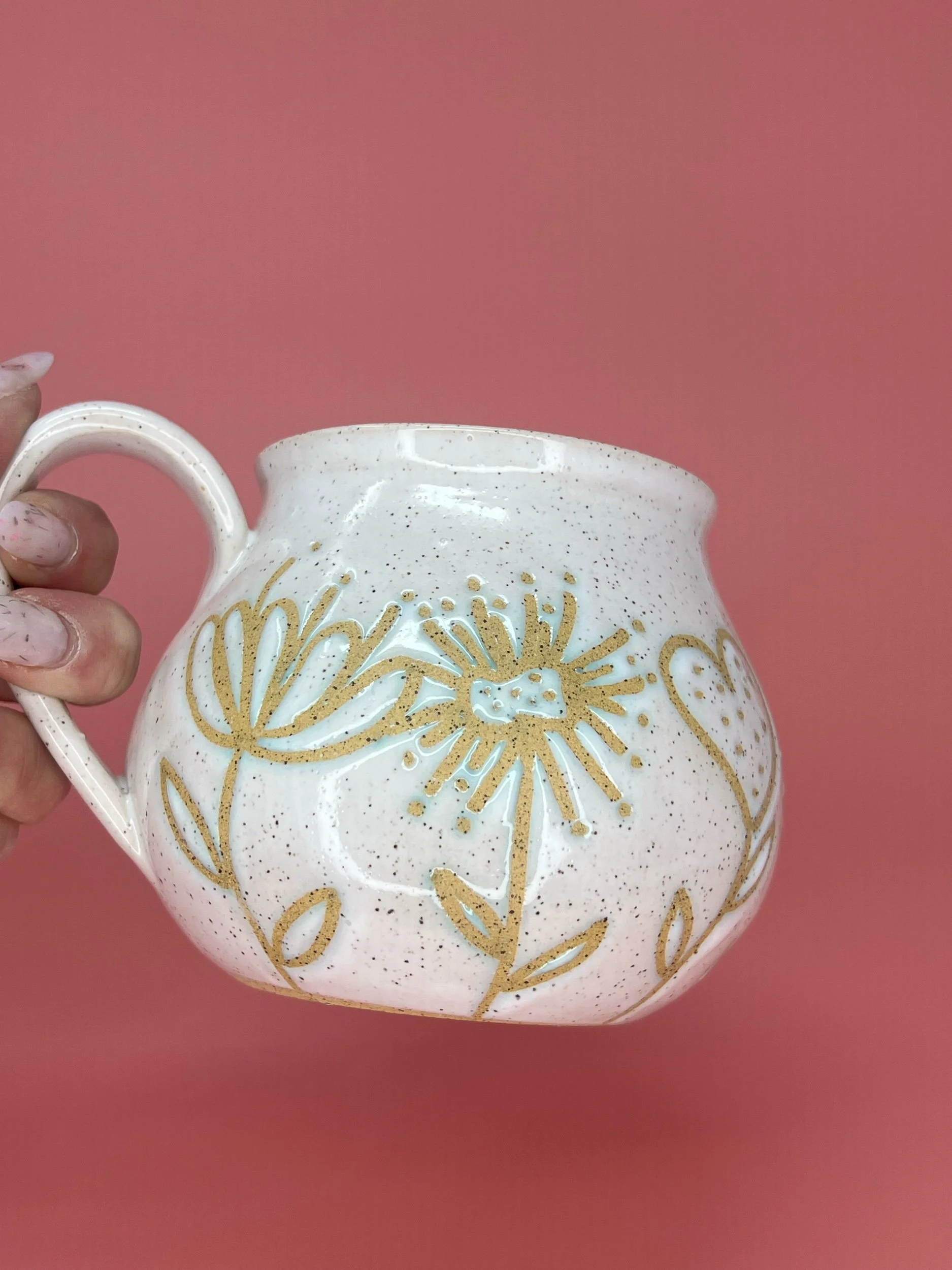 Wheel throne speckled clay belly mug. Approximately 14 ounces of fluid. Hand drawn, designs and finished in white gloss glaze. The mug is dishwasher and microwave safe.